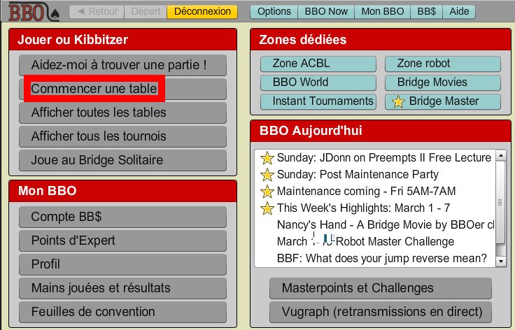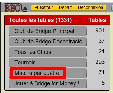 -« Cliquer pour jouer au bridge ou regarder »- et, au lieu de cliquer « Club de bridge principal » cliquer plus bas « matchs par quatre »- « Créer un match par 4 ».